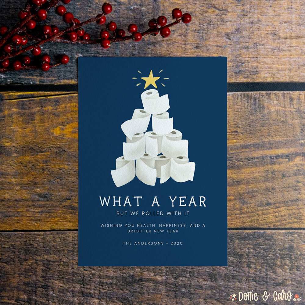 Some time in September as I was thinking about how I really needed to get my Christmas cards listed in my Etsy shop to get them all settled into the search and ready for prime time, I came up with an idea for a holiday card. There’s no denying that this year has been weird and hard and exhausting and unlike any other year we’ve ever experienced. (Please wear your masks and social distance!) To commemorate that, I got the idea to draw a stack of toilet paper rolls in the shape of a Christmas tree. And thus my We Rolled With It Christmas card was born.